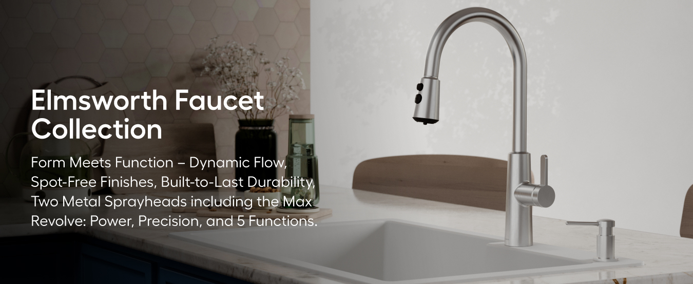 none: The Elmsworth Single-Handle Pull-Down Kitchen Faucet provides maximum clearance versatility with dual interchangeable sprayers featuring revolutionary Revolve aerator technology, blade spray power, and precision focused control. This innovative system includes two professional-grade sprayers in the box: a 3-function metal sprayhead with blade spray technology for tough cleaning, and a heavy-duty 5-function sprayhead with Revolve MAX double flip aerator featuring focused spray precision, max flow boost, and pause capabilities. The commercial-style stainless steel spring and smart 90° forward-rotating handle prevent backsplash interference while the 360° high-arc spout provides exceptional clearance for large cookware.