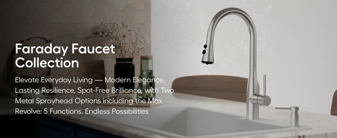 none: The Faraday Single-Handle Pull-Down Kitchen Faucet delivers streamlined versatility with dual interchangeable sprayers featuring revolutionary Revolve aerator technology and powerful blade spray for ultimate kitchen performance. This innovative system includes two professional-grade sprayers in the box: a 3-function metal sprayhead with blade spray technology for tough cleaning, and a heavy-duty 5-function sprayhead with Revolve MAX double flip aerator, max flow boost, and pause capabilities. The commercial-style stainless steel spring and smart 90° forward-rotating handle prevent backsplash interference while the 360° high-arc spout provides excellent clearance.