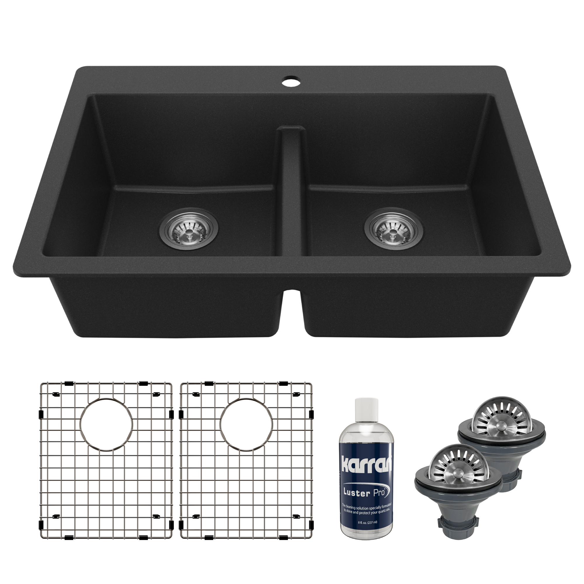 Karran 33" Top Mount Double Equal Bowl Quartz Kitchen Sink Kit in Black